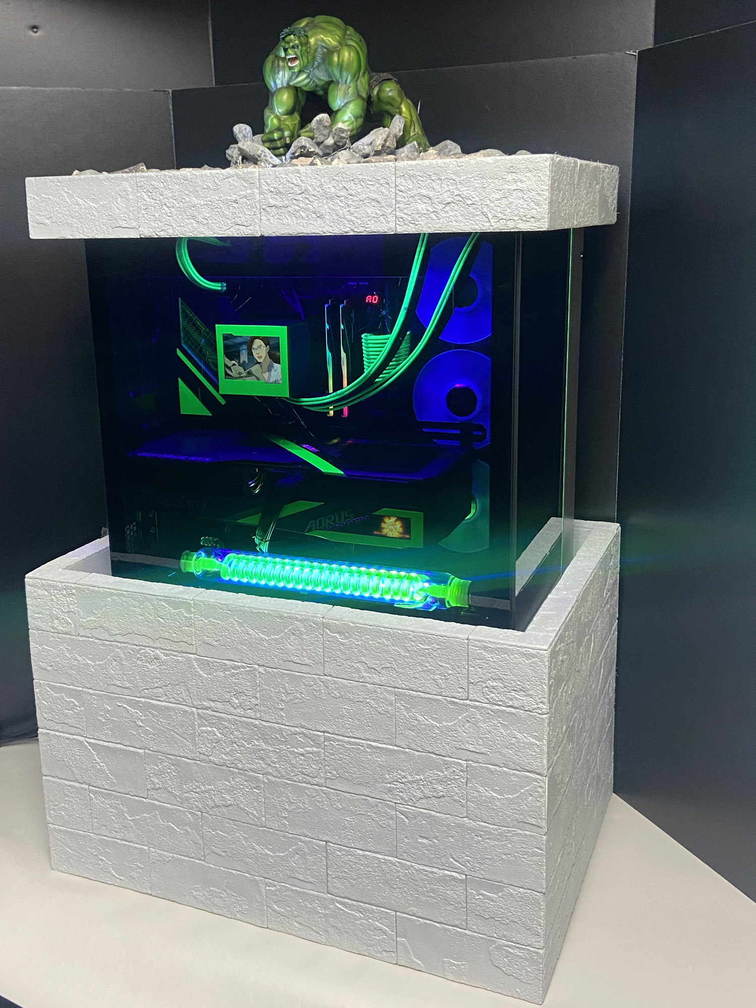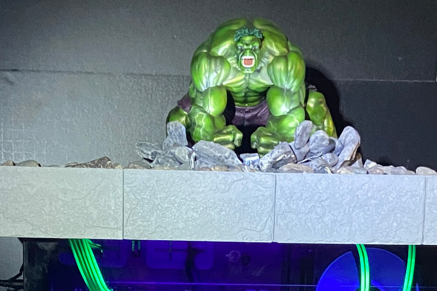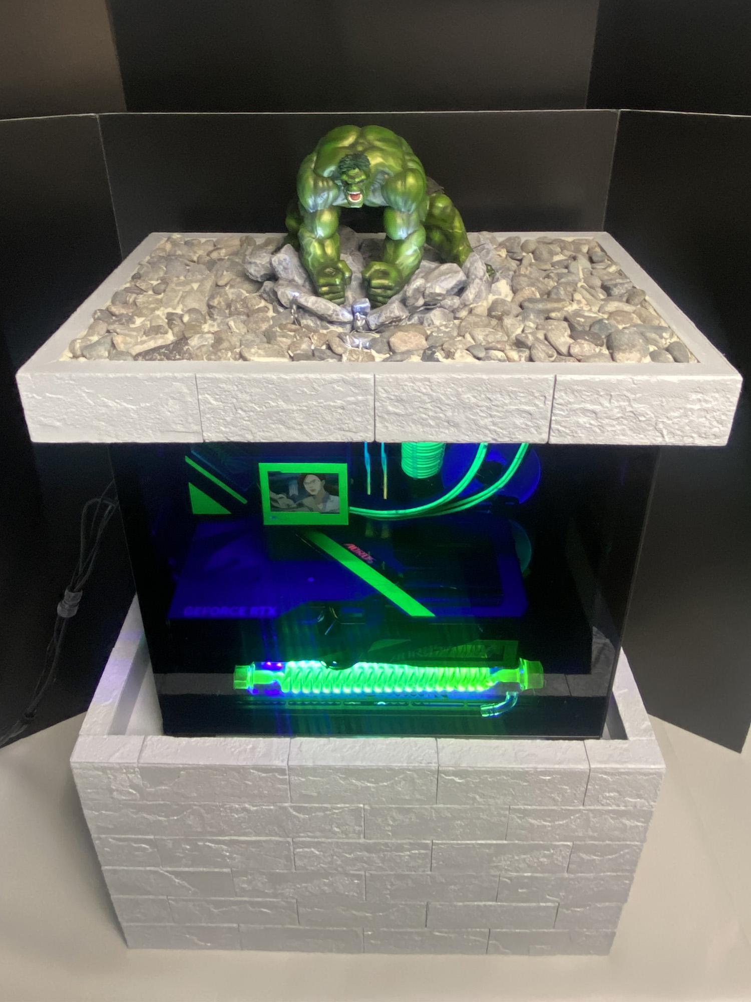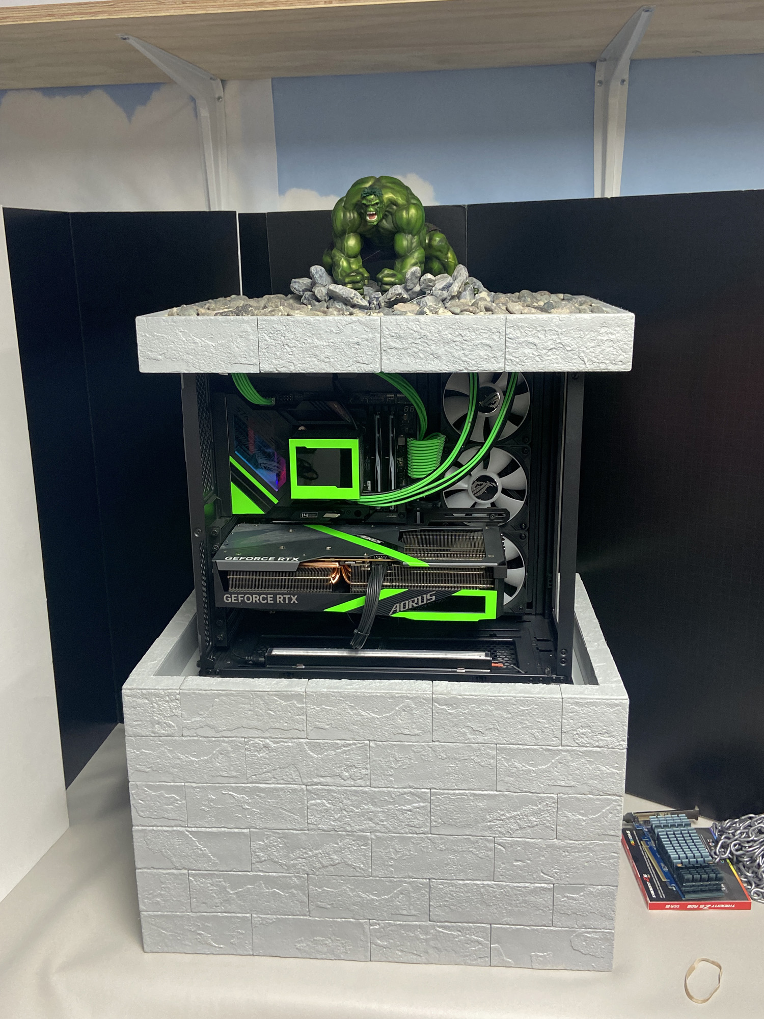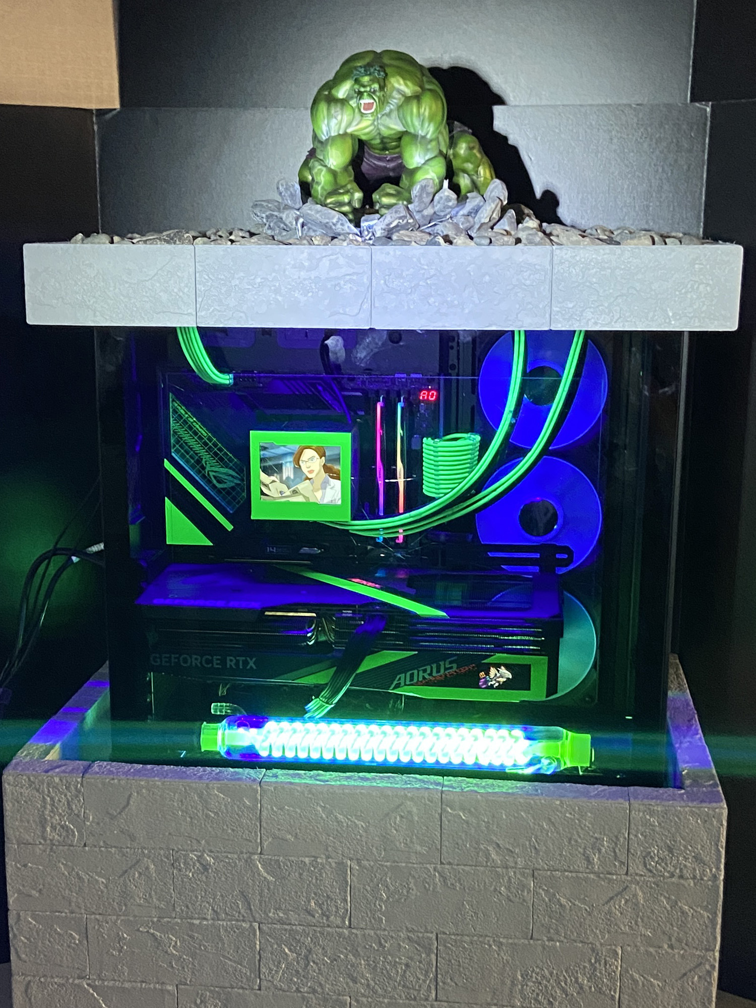 Build highlights include: Internal Blacklights, ASUS ROG AIO with Green Vinyl, Gigabyte 4090 Master with Green Vinyl, Green Power Cables, A MASSIVE Gray Base and a matching roof complete with hand laid real stones and integrated lights, very expensive Hulk Statue, and a Nuclear DNA Smasher. We also bought an iPad Tempered Glass Screen Protector and smashed it with a hammer, then adhered that to the inner glass of the case to make it look SMASHED!!!!