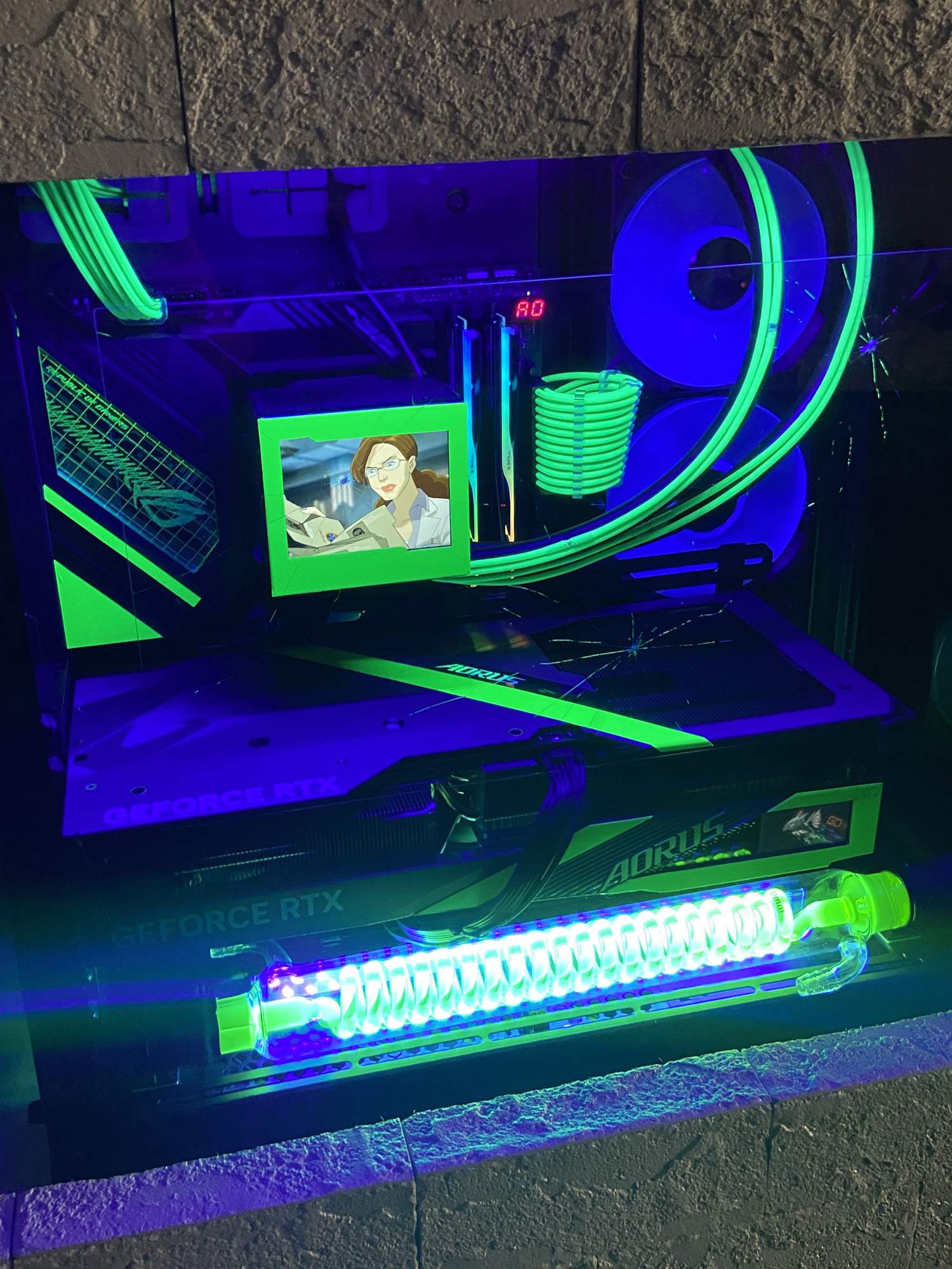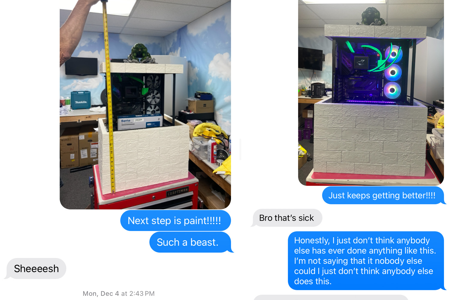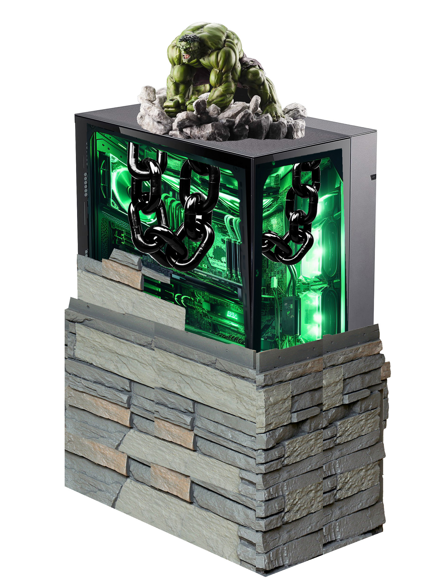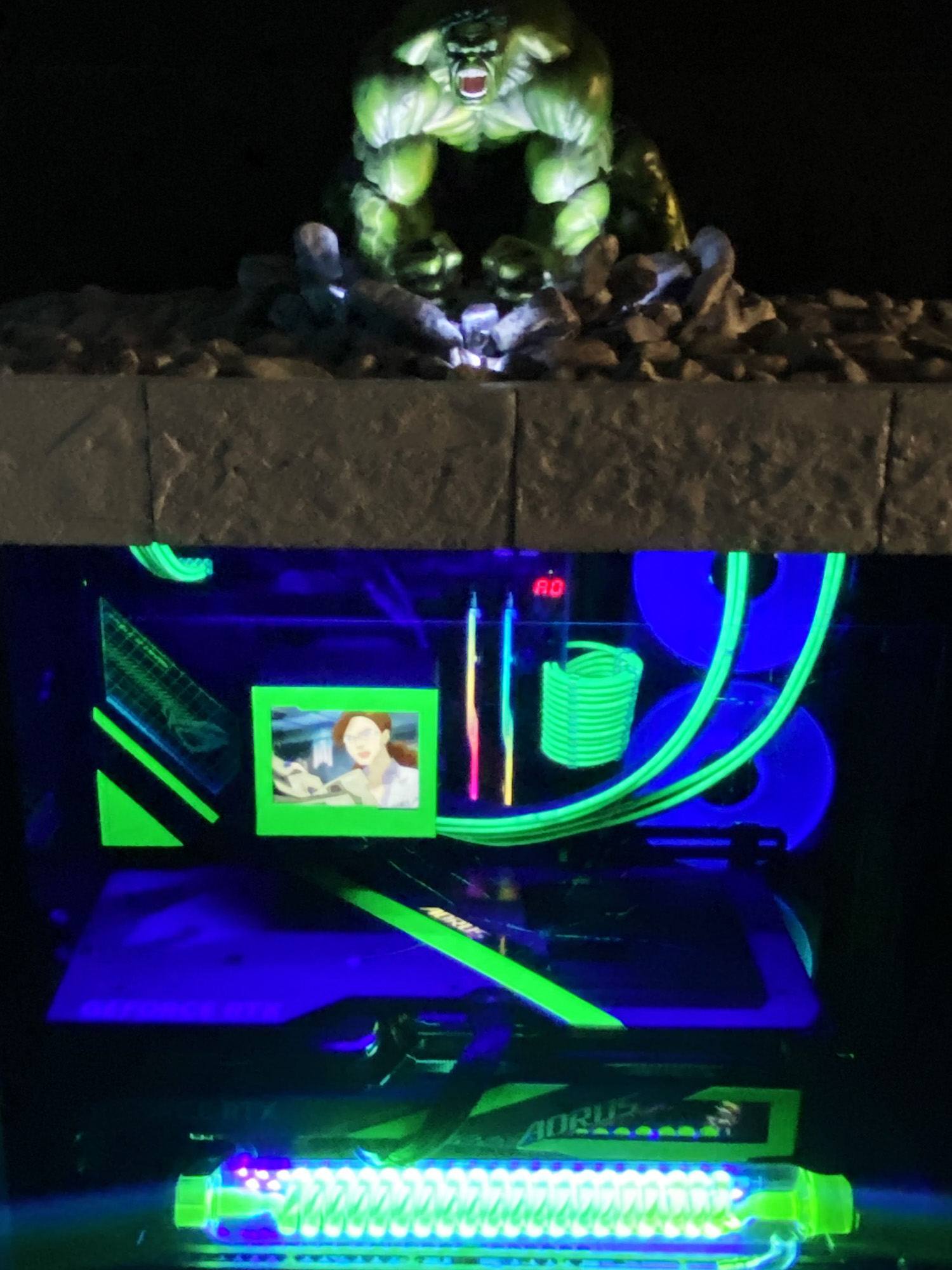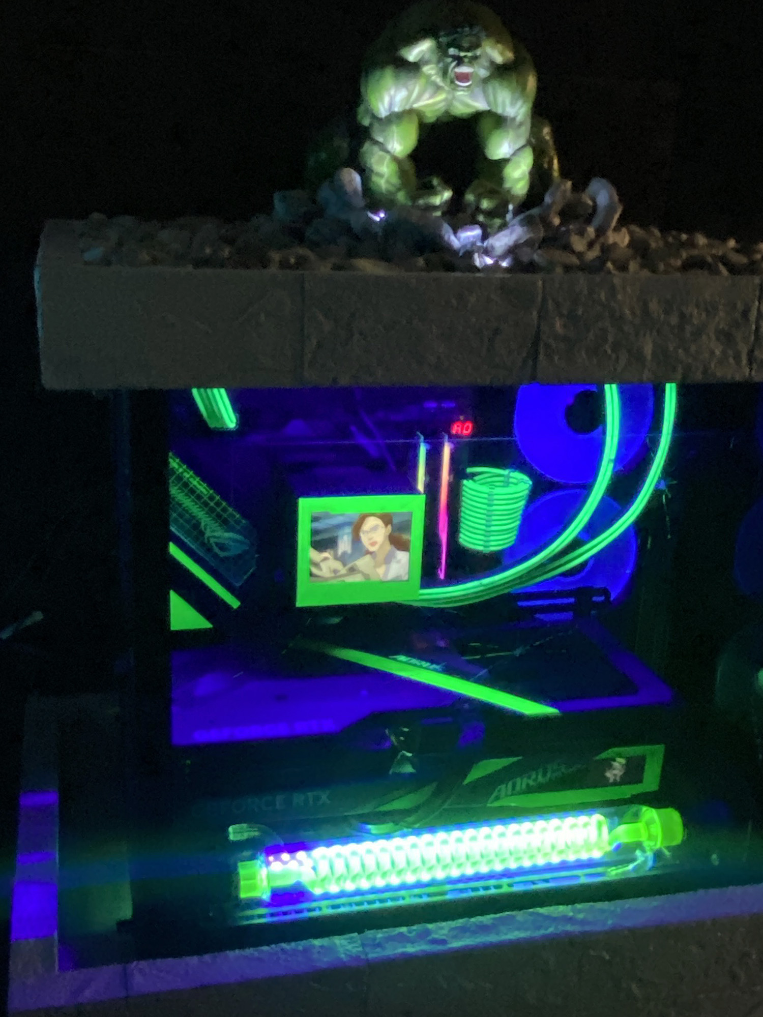 Build highlights include: Internal Blacklights, ASUS ROG AIO with Green Vinyl, Gigabyte 4090 Master with Green Vinyl, Green Power Cables, A MASSIVE Gray Base and a matching roof complete with hand laid real stones and integrated lights, very expensive Hulk Statue, and a Nuclear DNA Smasher. We also bought an iPad Tempered Glass Screen Protector and smashed it with a hammer, then adhered that to the inner glass of the case to make it look SMASHED!!!!