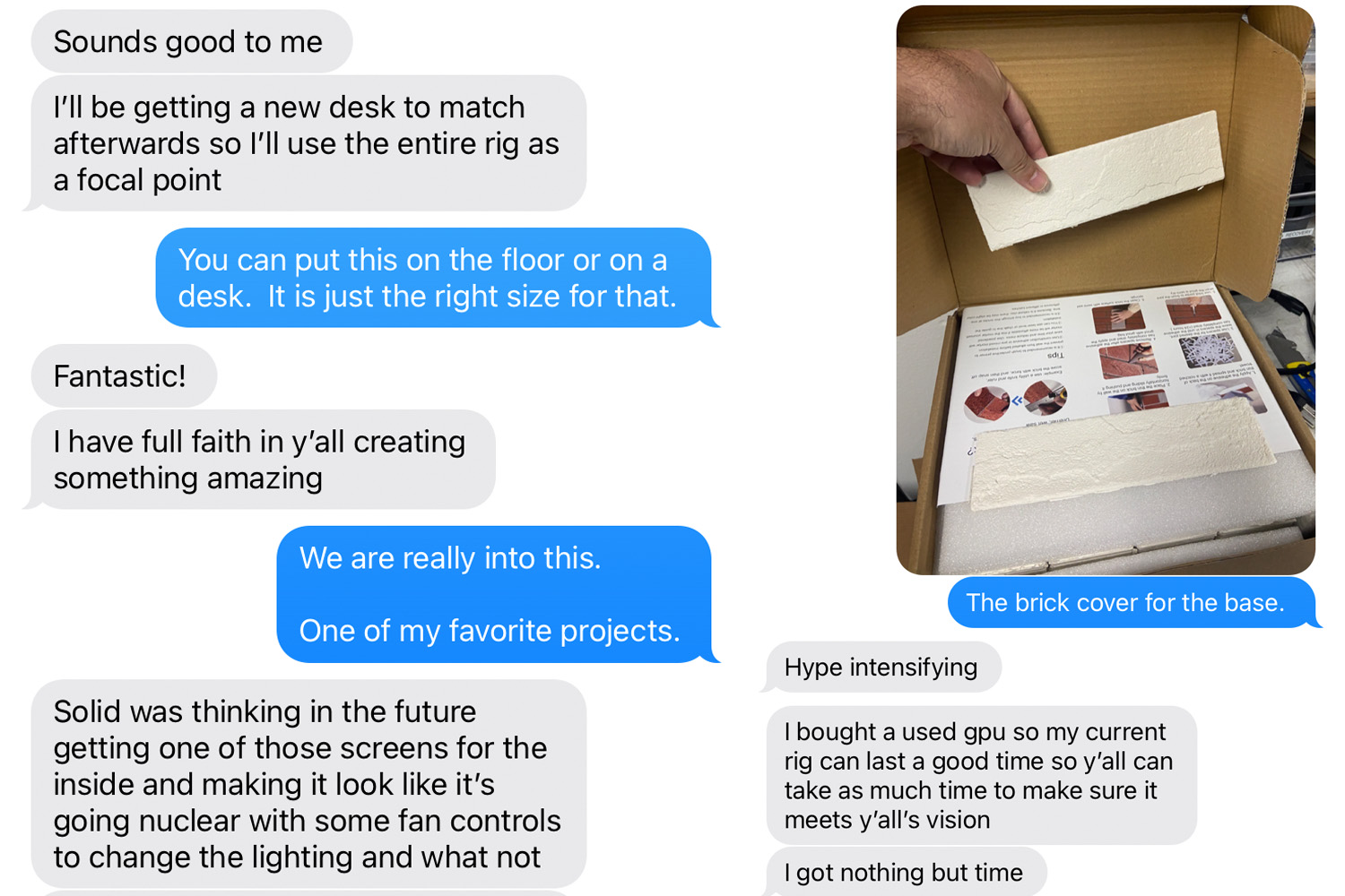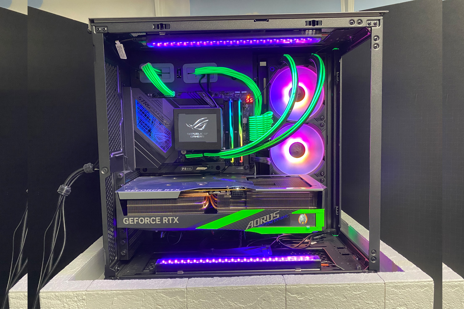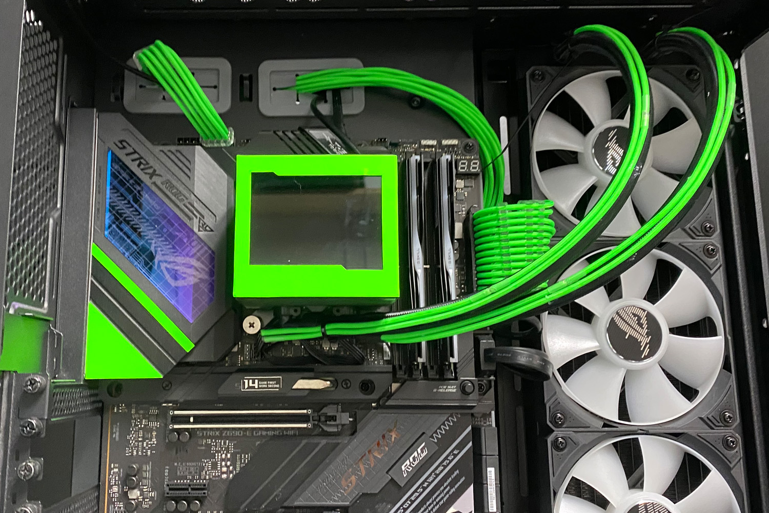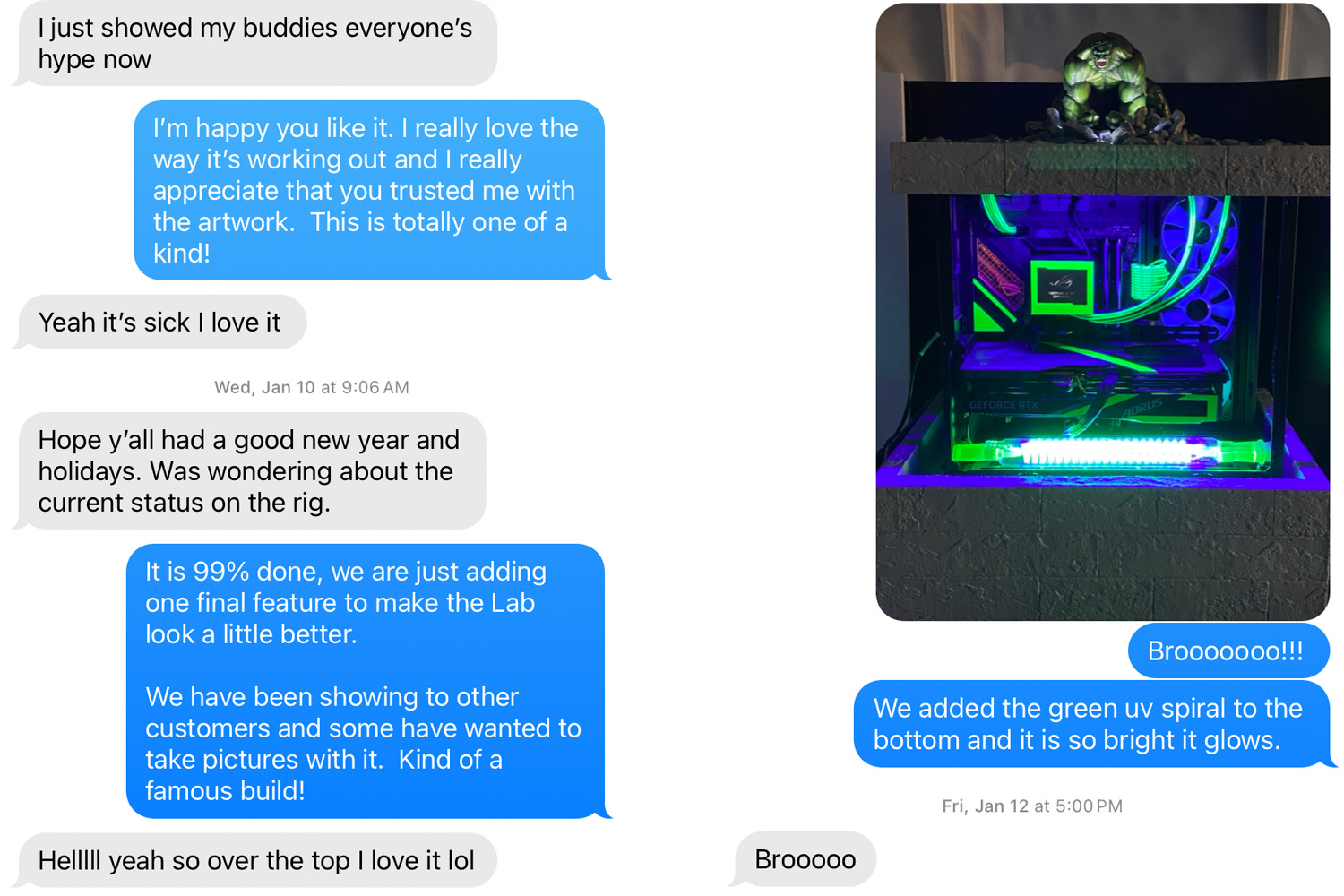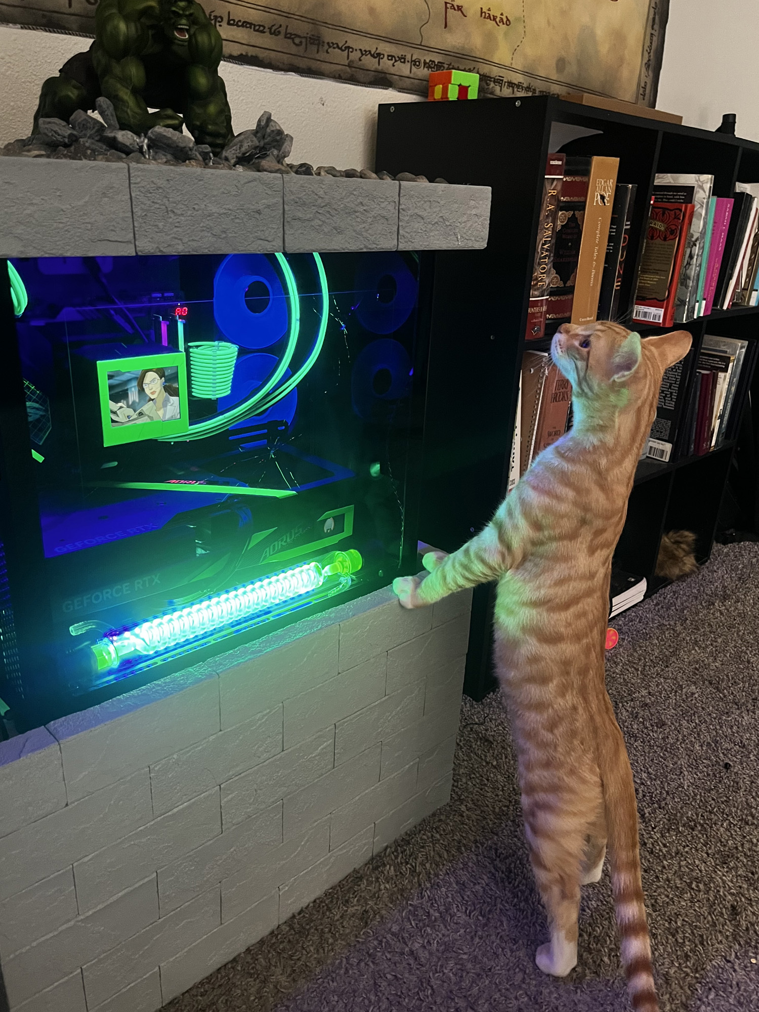 Build highlights include: Internal Blacklights, ASUS ROG AIO with Green Vinyl, Gigabyte 4090 Master with Green Vinyl, Green Power Cables, A MASSIVE Gray Base and a matching roof complete with hand laid real stones and integrated lights, very expensive Hulk Statue, and a Nuclear DNA Smasher. We also bought an iPad Tempered Glass Screen Protector and smashed it with a hammer, then adhered that to the inner glass of the case to make it look SMASHED!!!!